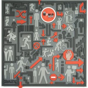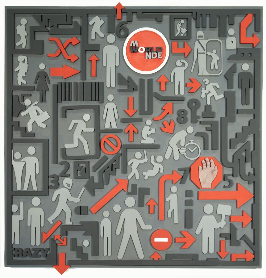 Mais c’est surtout la technique qui retient l’attention. Didier Valhère mixe les médiums : techniques traditionnelles cohabitent avec matières, bois découpé peint ou marouflé. Il compose souvent par strates : éléments collés sur toile ou panneau peint, lettres, pictogrammes, code barre et QR codes … L’ensemble tient souvent du bas relief, créant un volume subtil, jouant de la lumière et des points de vue où écriture et image se combinent pour une narration diffractée.